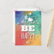 Sweet and simple abstract postcard says it all : BE HAPPY printed printed in a bold white font highlighted with white flowers and butterflies with an abstract geometric background in complementing shades or red, blue, green, and orange.