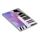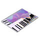 Notebook with my colourful abstract keyboard design with flowing light blue and orange stripes and purple and blue tones.