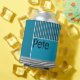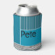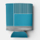 This can cooler has a geometric design of a large teal rectangle in the upper left corner, darker teal stripes in the upper right corner, a lighter smaller teal rectangle below the stripes, and black lines across the bottom. If you like the design but prefer different colours, message me.