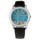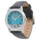 This men's watch has a geometric design of a large teal rectangle in the upper left corner, darker teal stripes in the upper right corner, a lighter smaller teal rectangle below the stripes, and black lines across the bottom. If you like the design but prefer different colours, message me.