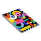 Colourful abstract pattern with word love inside, eyes, tears, colour blocks. Pattern illustration with bright colour-blocking shapes. Trendy colourful pop art geometric pattern with bold shapes on black.