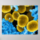 Photo produced by the National Institute of Allergy and Infectious Diseases (NIAID), under a magnification of 20,000X, this digitally-colorized scanning electron micrograph (SEM) depicts a number of mustard-coloured, spheroid-shaped Staphylococcus aureus bacteria that were in the process of escaping their destruction by blue-coloured human white blood cells (WBCs).