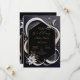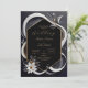 This image features an abstract and sophisticated design. The design showcases a black hexagonal frame outlined in gold, set against a dark background. Flowing white and grey ribbon-like elements gracefully encircle the frame, creating a sense of movement and elegance. The design is accented with delicate gold details and small, stylized leaves in muted tones. At the bottom left corner, a large, white flower with a gold centre adds a touch of organic beauty to the composition. The overall aesthetic is modern and refined, with a monochromatic colour scheme that is complemented by subtle gold accents. This design would be perfect for a chic and contemporary wedding, particularly one that embraces a minimalist or black-tie theme. Personalize the text regarding the names and details of the wedding. You can download the card to your mobile device or computer.