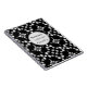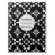 Personisable notebook with spiral binding made stylish with a monochrome pattern of white and grey dots and oval shapes on black background. The easy to use text template makes is possible to personalise all rows of text as well as the circle around the text.