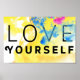 "LoveYourself" is a motivational poster that reminds us to love ourselves. The graphic is in black text with a beautiful abstract of dreamy yellow, fuchsia and blue brushstrokes.
