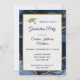 Customizable Graduation invitation with navy blue and gold faux agate design.