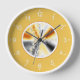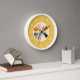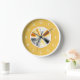 This round wall clock features an abstract fractal art in orange, white and black on a white round frame and a pastel orange background with white numerals.