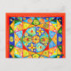 Vibrant geometric patterns fill the image, featuring circles, triangles, and swirls in a kaleidoscope of colours including blue, green, yellow, and red. The intricate design creates a sense of symmetry and balance.