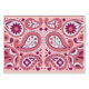 This note card has an abstract paisley pattern of daisy flowers and tear drop shapes in shades of pink and white on a light pink background.
