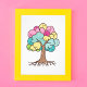 The entire brain-canopy is a tapestry of soft, pleasing pastel hues. The left hemisphere is composed of various shades of light green, pale yellow, and muted turquoise, while the right hemisphere features a collection of pink and deeper yellow-orange tones. Each individual lobe has a dark brown outline and subtle, hand-drawn creases, further emphasizing the brain-like texture and form. The combination of the organic, growing tree structure with the cerebral, thought-filled brain creates a powerful metaphor for wisdom, knowledge, creativity, and the idea of nourishing one's mind for intellectual and personal growth. It's a charming and thoughtful piece of art that blends natural imagery with mental health and cognitive themes.