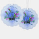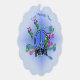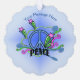 This hanging ornament card has a blue peace sign with the text Peace in an abstract design of pink blue, and green scrolls and stars on a blue background. Customize your text with the templates on the front and back.