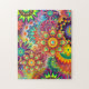 If you like a challenge when it comes to puzzles, then this one is sure to please, or drive you crazy! An abstract psychedelic design with mandalas in bright yellows, lime green, electric blue, magenta, and orange.