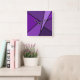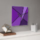 Inspired by stained glass, this stylish geometric design contains polygons in various shades of purple outlined in black. A lavender triangle slashes in from the upper right with an array of progressively darker purple quadrangles and other shapes spiralling around it from light to dark. Two dark purple shapes ground the left side of the original design.