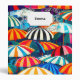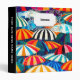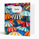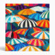 A cheerful depiction of sun-soaked days and seaside relaxation with colourful striped beach umbrellas.