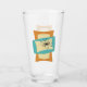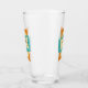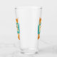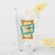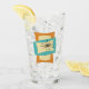 This funky mid century modern glass tumbler features squeezed and stretched rectangle shapes in the colours turquoise blue, cream, and orange. Starburst accents in pink, blue, gold, and black highlight the design.