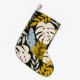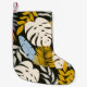 Abstract seamless pattern with tropical leaves and small christmas stocking