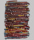 Horizontal streaks of various colours are layered, producing a rhythmical, abstract pattern. Small, white vertical lines are interspersed throughout the composition, adding a contrasting element.