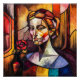 A striking abstract portrait of a woman in stained glass style, accented with a vivid rose. Bold colours and geometric shapes create a modern, artistic statement piece.