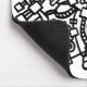 A mouse pad with an quirky hand drawn abstract surreal design, a network of shapes link together with wire like shapes which looks both natural and machine like.