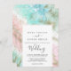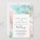 This abstract summer watercolor wedding invitation card is perfect for a modern wedding. The unique elegant design features light blue, mint green, blush pink and pastel purple watercolor with splashes of gold glitter, creating a whimsical beachy feel.