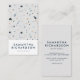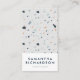 A smart and professional vertical business card, featuring a light blue/grey background overlaid with a terrazzo pattern of abstract shapes in navy blue, light blue and terracotta. The bottom of the card is white with your name and service details in navy blue and light blue font.. The reverse side is in light blue/grey with business and contact details in navy modern font. This design is great for interior designers or any other professional.