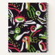 This artistic pattern is inspired in tribal art with a modern twist of a vibrant colour palette over dark background. The pattern feels dynamic and unique with its eye shaped drawings and colourful doodles