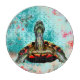 A hand drawn depiction of a turtle with an abstract background. Colours used: red, blue, teal, green, yellow, purple.
