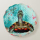 A hand drawn depiction of a turtle with an abstract background. Colours used: red, blue, teal, green, yellow, purple.