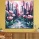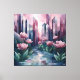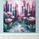 Add elegance to your walls with this enchanting abstract urban garden artwork. Featuring geometric towers rising against a soft pink and blue sky, the scene is beautifully complemented by delicate pink flowers and a reflective water pathway. The harmonious blend of natural and architectural elements creates a dreamlike aesthetic, perfect for modern and minimalist interiors. Ideal for art lovers who appreciate innovative designs, this canvas brings a serene yet dynamic energy to living spaces, offices, or creative studios