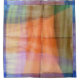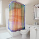 The abstract, original design by ZoeSPEAK on this Shower Curtain suggests a view, through a window, of a landscape. The border is in shades of blue, and the interior is in shades of orange and green with pale yellow and pink highlights. There are linear bands with holes punched in them crisscrossing the design.