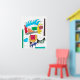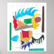 The artwork is a colourful abstract composition featuring a variety of geometric and organic shapes. Prominent elements include a bold blue wave-like shape at the top, a yellow sunburst with a red dotted circle, and a mix of rectangles and jagged forms in shades of red, orange, and green. the diverse forms are interconnected with strong black lines and set against a grid-like background, creating a dynamic and vibrant visual experience.