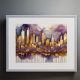 Abstract Watercolor Painting Gold Cityscape Grey Purple Blue The aspect ratio is 4:3 . It was designed to be printed as 32"x24"