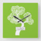 Abstract white circle tree and name lime green Square Wall Clock without numbers. A lovely abstract tree made of circles instead of leaves adorn this wall clock. It also includes a frame with personalized name.