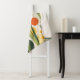 Bold yellow and orange daffodils and tulips bloom on this design, in a style reminiscent of mid century modern.
