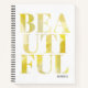 Trendy notebook featuring the word 'Beautiful' created using a bold serif font in soft abstract shades of yellow on a simple white background.The abstract design covers the reverse side. Customize the front with your name or any wording to fit your style.