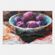 What could be more fulfilling than a handmade pottery bowl, stuffed full with juicy plums, resting on a home-made patchwork quilt? Featuring brown, amethyst, and teal colours, this vision of domestic bliss satisfies.