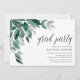 Elegant botanical invitations for chic graduation celebrations feature watercolor eucalyptus leaves and green foliage cascading from the upper left corner. Customize with your graduation party details aligned at the right and embellished with chic calligraphy script. Invitations reverse to solid forest green.