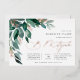 Elegant gender neutral b mitzvah invitation features watercolor eucalyptus leaves and green foliage cascading from the upper left corner, embellished with rose gold foil accents. Personalize with your temple ceremony and celebration details aligned at the right. Cards reverse to solid forest green.