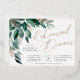 Elegant wedding rehearsal dinner features watercolor eucalyptus leaves and green foliage cascading from the upper left corner, embellished with rose gold foil accents. Personalize with your ceremony rehearsal and celebration details aligned at the right. Cards reverse to solid forest green.