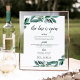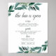 Invite guests to grab a favourite libation with our charming wedding bar sign. 11x14 bar sign features a "the bar is open" in calligraphy script lettering. Personalize with your bar menu or signature cocktails with six custom text fields, and add your initials and wedding date along the bottom. A chic addition to your wedding bar setup to share your signature cocktails, wine selections and more. Adorned with watercolor botanical greenery and eucalyptus leaves that match our Abundant Foliage wedding collection.
