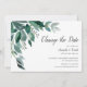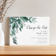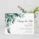 Chic botanical wedding postponement announcement features lush green eucalyptus leaves illustrated in watercolor. Personalize with your wedding details aligned at the right in a mix of traditional block and modern calligraphy typefaces. Cards reverse to solid forest green.