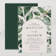 Elegant wedding invitations featuring your wedding details nestled inside of an arched frame surrounded by eucalyptus, ferns, and other rich greenery with a cream background. The botanical arch wedding invitations reverse to a solid dark green background. Designed to coordinate with our Abundant Greenery wedding collection.