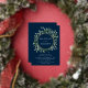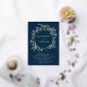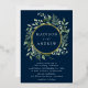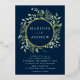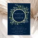 Elegant wedding invitations featuring your names encircled by gold foil with eucalyptus leaves, fern fronds, and other rich greenery on a navy background. Personalize the gold foil wedding invitations by adding your wedding details below. The modern botanical wedding invitations reverse to a solid navy blue background. Designed to coordinate with our Abundant Greenery wedding collection.