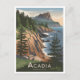 A picturesque and nostalgic depiction of Acadia National Park, celebrated for its rugged coastline, granite peaks, and lush forests. The design captures iconic sights such as Cadillac Mountain, the rocky shores along the Atlantic Ocean, and vibrant fall foliage, showcasing the park’s diverse landscapes. Rendered in a vintage style, the artwork evokes the natural beauty and serene atmosphere of Acadia National Park, inviting viewers to explore its scenic trails, rich wildlife, and breathtaking ocean views.