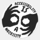 A round white sticker with a black round all-caps font and international symbol for sign language interpretation large and in the centre. The text is round with the shape of the sticker. It reads, "ACCESSIBILITY IS A NECESSITY"