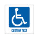Accessibility sign. Wheelchair symbol. Stylized white person on a wheelchair. Blue background. Custom text.