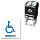 Accessibility sign. Wheelchair symbol. Stylized white person on a wheelchair. Custom text.