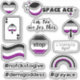 An assortment of asexual stickers with the black grey white and purple asexual flag, ace of spades, fun hashtags, a stop sign, an ace rainbow and more.