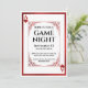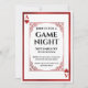 Cette invitation à la soirée de Game Night présente un design classique de carte de jeu. Un cadre de style vintage orné entoure la zone de texte centrale. Un cadre de conception de feuille rouge assorti borde l'invitation. Deux coeurs rouges et le monogramme de l'As sont imprimés dans des coins opposés, comme la disposition d'un jeu de cartes.