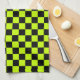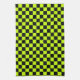 A vibrant checkerboard pattern with alternating neon yellow and black squares creates a striking geometric design, conveying a bold and energetic tone.